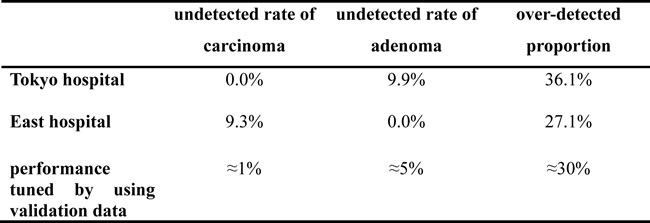 Our system was taught through training data of several thousands in different medical facilities, and was tuned to satisfy the above requirements using validation data. The details of the validation data were 15% of G5, 35% of G3, and 50% of G1. Our system was tuned so as to have the following performance: the undetected ratio of carcinoma ≈1%, the undetected ratio of adenoma ≈5%, and the over-detected proportion ≈30%.