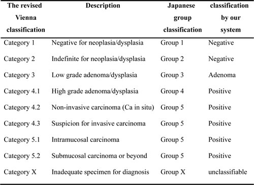 The Japanese Group Classification is applied only to endoscopic biopsy materials, and is applied only to epithelial tissue. Materials obtained by polypectomy, endoscopic resection, or surgery were not included. Japanese Group Classification is as follows: Group X—inappropriate material for which histological diagnosis cannot be made; Group 1—normal tissue or non-neoplastic lesion; Group 2—material for which diagnosis of neoplastic or non-neoplastic lesion is difficult; Group 3— adenoma; Group 4—neoplastic lesion that is suspected to be carcinoma; and Group 5—carcinoma. To resolve the differences between the conventional Western criteria and the Japanese Group Classification, the Vienna Classification was established to combine the basic concepts of the conventional Western criteria. The revised Vienna classification [9] has been widely accepted and consists of five categories, and corresponds to the Japanese Group Classification as follows: Category 1—negative for neoplasia/dysplasia (Group 1); Category 2—indefinite for neoplasia/dysplasia (Group 2); Category 3—low grade adenoma/dysplasia (Group 3); Category 4.1—high grade adenoma/dysplasia (Group 4); and Categories from 4.2 to 5.2—non-invasive carcinoma to submucosal carcinoma or beyond (Group 5). The Japanese Group Classification and Vienna Classification schemes are shown in Table 1.