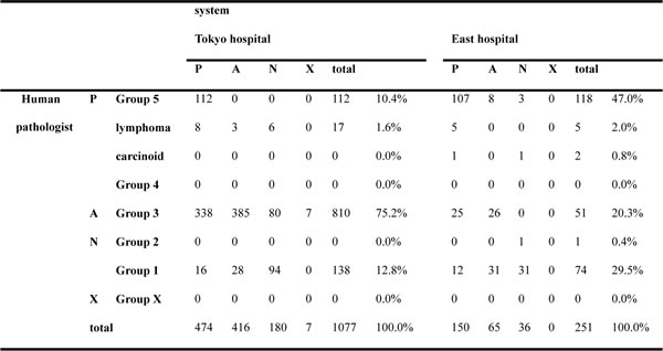 During the 15-week evaluation period in this validation study, the following procedures were performed every weekday. Glass slides were anonymized at each of the hospitals, and then converted to a WSI by the NanoZoomer 1.0-HT digital slide scanner (Hamamatsu Photonics K.K., Hamamatsu, Japan) at Tokyo hospital, and the NanoZoomer 2.0-HT digital slide scanner (Hamamatsu Photonics K.K) at East hospital, at 40x (0.23 µm/pixel) magnification. The WSI files of East hospital were encrypted on the server located on site, transferred to the server at Tokyo hospital via network, and decrypted, all completely automatically. The system automatically detects WSI files of both Tokyo hospital and East hospital, and starts analyzing the detected WSIs. All aspects concerning the pathological diagnoses by the pathologists were undisclosed to researchers and statisticians during this period.