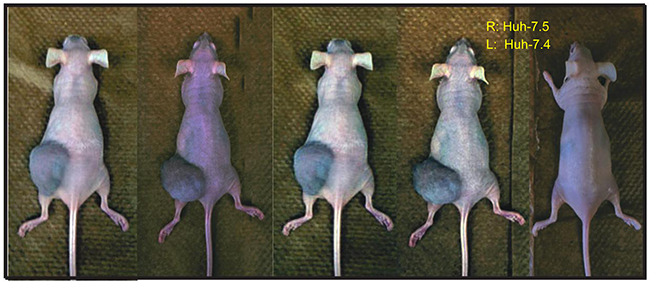 Figure 1: Tumorigenicity of Huh-7.4 and Huh-7.5 cell lines. A total of 3×106 viable Huh-7.4 and Huh-7.5 cells in 100 μl of PBS (with Ca2+/Mg2+) were injected into the left and right flank of 5 nude mice (6 weeks old female), respectively. A total of 5 mice were used for the experimental condition. The tumor development was monitored weekly over a period of 6 weeks.