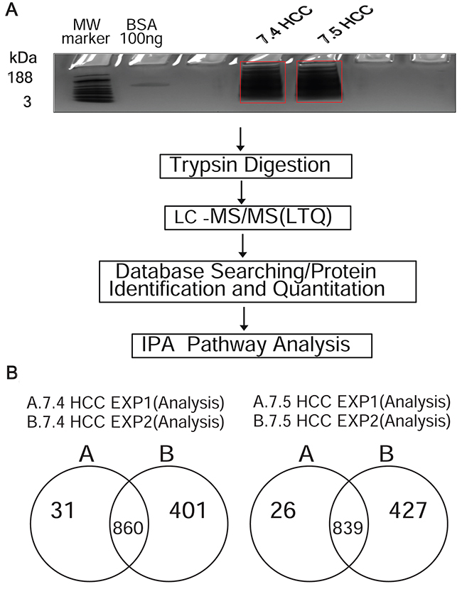 Figure 2: (A) Schematic overview of the experimental workflow. The workflow used in the IPA-conjugated proteomics analysis of Huh-7.4 and Huh-7.5 cell lines. A total of 20 μg proteins from each replicate were separated on short-stack gel, extracted and digested with trypsin. Peptides were then subjected to LC-MS/MS. The resulting spectra were searched for identification and quantification. The identified and quantified proteins were then analyzed using Ingenuity Pathways analysis software (IPA). (B) Number of common proteins identified in Huh-7.4 and Huh-7.5 by LC-MS/MS for two independent experiments. A list of proteins using database searching were generated, mapped and analyzed by IPA in duplicate performed in the same manner for each cell line.