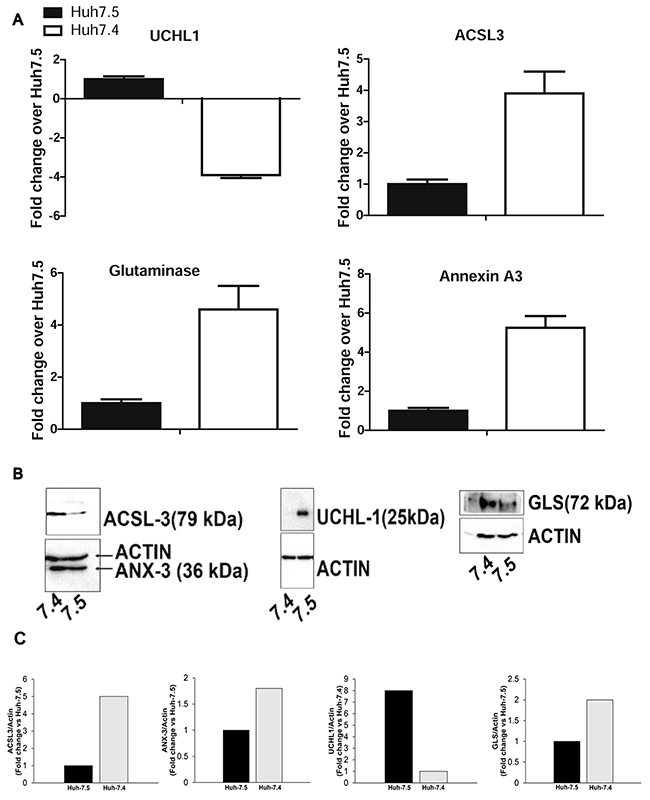 From the list of proteins that appeared to be differentially expressed between Huh-7.4 and Huh-7.5 cell lines, GLS (glutaminase kidney isoform, mitochondria), ANXA3 (Annexin A3), ACSL-3 (long chain fatty acyl-coA synthetase 3), and UCHL-1 (Ubiquitin C-terminal hydrolase-L1) proteins have previously been connected to HCC and cancer in general [16, 17]. IPA analysis also predicted that these proteins played a role in cancer, free radical scavenging, and amino acid metabolism networks. To validate our mass spectrometry data, we confirmed the levels of GLS, ANXA3, ACSL3 and UCHL-1 expression by Western blot. It was shown that Huh-7.4 cells express higher levels of GLS, ANXA3 and ACSL3, and virtually undetectable UCHL1 (Figure 5A). These findings are consistent with the results from proteomic analysis, showing 3-fold higher expression of GLS, ANXA3 and ACSL3 and a 3.9-fold lower expression of UCHL1 in Huh-7.4 versus Huh-7.5 cells (Figure 5B).