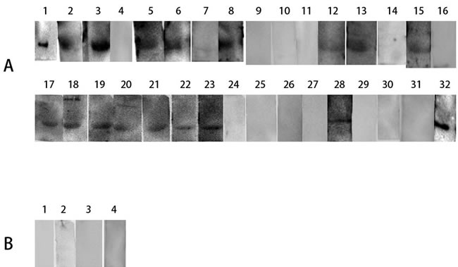 Figure 3: Immuno-reactivity to IgE of Can f 6. Immuno-reactivity to IgE of Can f 6 was identified by western blot analysis. A. Can f 6 were incubated with sera of dog allergic patients as the first antibody. B. Can f 6 were incubated with sera from 4 healthy individuals as a negative serum control.