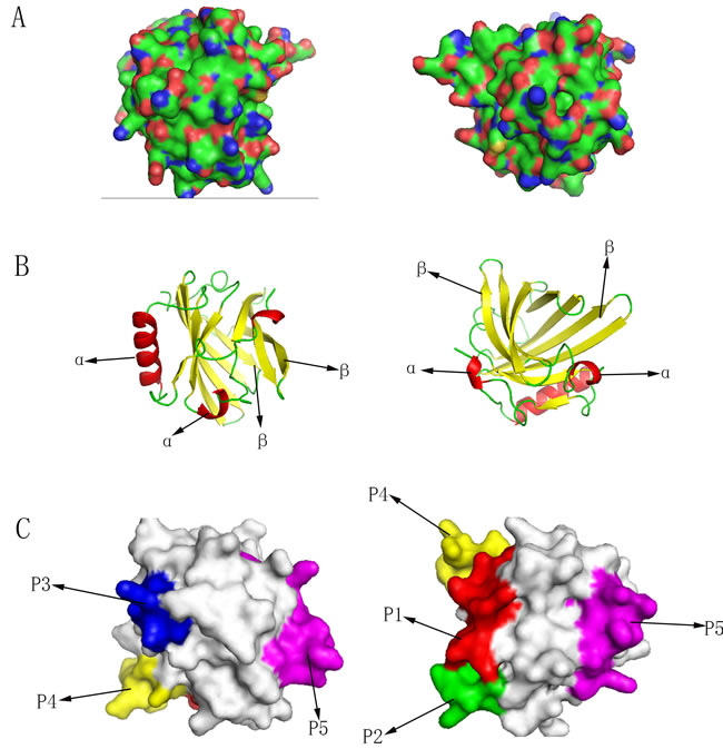 Figure 5: 3D structure of Can f 6. A. Protein structures of Can f 6 homology model. B. Predicted secondary structure showed on the surface of Can f 6 structure. The red symbolized α-helices and the green symbolized β-sheets marked with arrows. C. Predicted B-cell epitopes showed on the surface of Can f 6 structure marked with arrows. P1 (Marked with red): SDIKEKIEENGS; P2 (Marked with green): TKVNGKCT; P3 (Marked with blue): KTEKDGE; P4 (Marked with yellow): NVNQEQEF; P5 (Marked with pink): GRKPDVSPKVKEKF.