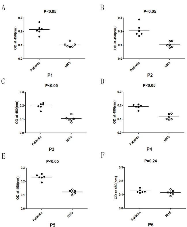 The specific IgE binding of predicted B cell peptides was detected by ELISA using dog allergic children’s sera (n = 6). The results of all peptides (P1, P2, P3, P4, P5) of patients was about OD = 2 times of the control NHS (Normal Human Serum). Among 5 B cell peptides, all of the peptides reacted with the 6 dog allergic children’s sera and showed significantly different IgE binding (p < 0.05) compared to NHS. However, to the unrelevant control peptide (P6), there is no significantly different IgE binding (p = 0.24) compared to NHS. (Figure 6)