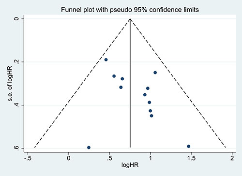 Figure 5: Funnel plot of the publication bias for the analysis of the independent role of ANRIL in OS in the different cancer types.