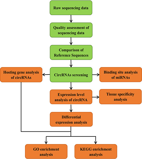 According to the manufacturer’s protocol, total RNAs were extracted from frozen tissues after grinding with liquid nitrogen using TRIzol (Invitrogen, CA, USA). Using Bioanalyzer 2100 and RNA6000 Nano Kit (Agilent, CA, USA) detected quantity and purity of total RNAs. Take the same amount of RNAs from three adult sheep and three embryos sheep were respectively pooled to construct library. In order to establish a cDNA library of circRNAs, we take approximately 10 μg of total RNA and use Rnase R (RNR-07250, epicentre) to digest linear RNA. We used IlluminaHiseq 2000/2500 to perform paired-end sequencing on the cDNA library of circRNAs according to the recommended protocol. CircRNAs analysis was performed following the steps in the pipeline (Figure 1). Low quality data was deleted, and reference genome and gene annotation was downloaded from the genome website (http://genome.ucsc.edu/). Index of the reference genome was built using Bowtie v2.0.6, and paired-end clean reads were aligned to the reference genome by using TopHat v2.0.9. CircRNAs candidates were predicted as described previously [40]. Only those who contain more than two independent junction-spanning reads and correspond to the GU / AG intron rules can be determined as a circRNA.