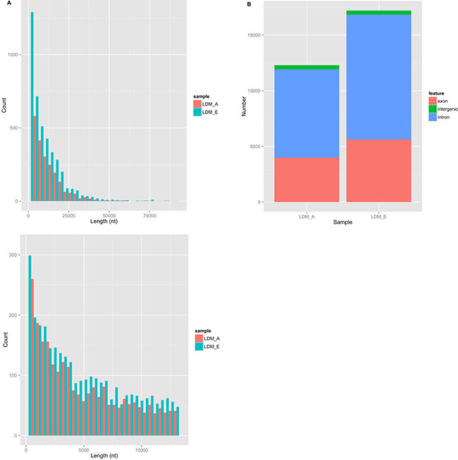 Figure 2: The information of circRNAs in sheep muscle by deep sequencing. (A) The length of circRNAs in sheep muscle. Light red on behalf of LDM_A and light blue on behalf of LDM_E. (B) The number of introns, exons and intergenic of circRNAs in sheep muscle.