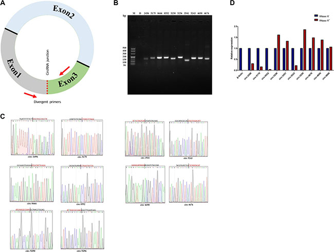 Figure 3: Verification of circRNAs data from RNA-sequencing. (A) Divergent primers to amplify the circular junctions. Red arrows represent divergent primers. (B) RT-PCR amplification of circRNAs with divergent primers. PCR products of circRNA 0002456, circRNA 0005179, circRNA 0000666, circRNA 0000552, circRNA 0005250, circRNA 0005256, circRNA 0003541, circRNA 0005243, circRNA 0004690 and circRNA 0004676 were analysed by gel electrophoresis. (C) Head-to-tail junctions were confirmed by DNA sequencing. The unmatched bases in circRNA 0005256 and circRNA 0003541 are indicated in green. (D) Resistance test of circRNAs to RNase R digestion by Real-Time RT-PCR. β-Actin was used as a linear control. Error bars indicate ± SD.