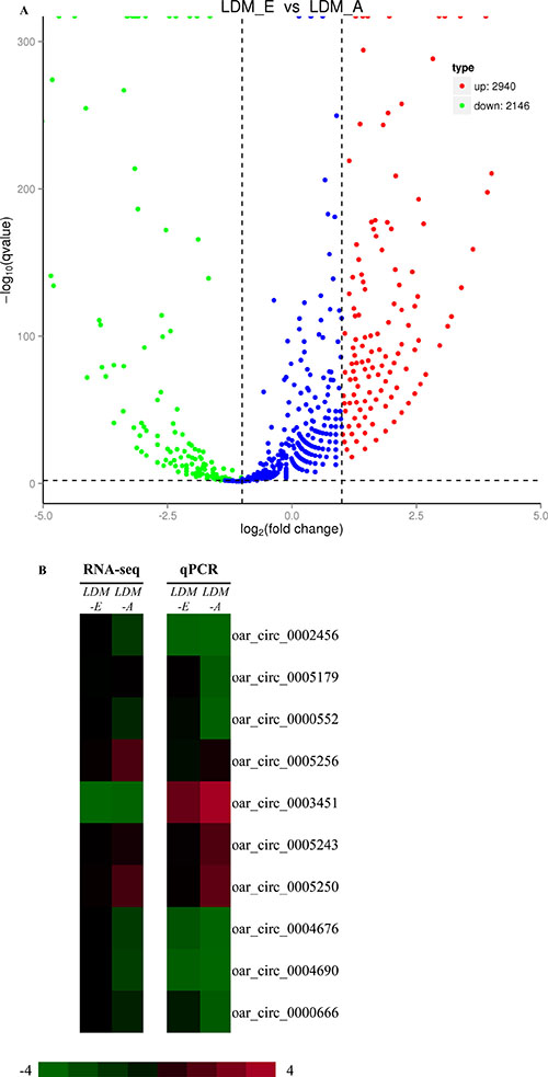 Figure 4: Analysis and validation of differentially expressed circRNAsin LDM_E and LDM_A group. (A) The volcano plot analysis of all circRNAs between LDM_E and LDM_A group. The logarithm of the significant difference between the two samples was analyzed by log2 (fold change) as the abscissa, and the negative logarithm-log10 (P-value) of the P value was calculated as the ordinate (P < 0.05).Red dots indicate up-regulated genes; green dots indicate down-regulated genes. (B) Heapmap analysis of ten differentially expressed genes was performed with data from RNA-seq and Real-Time RT-PCR. Green represents low expression, and red represents high expression, P < 0.05.