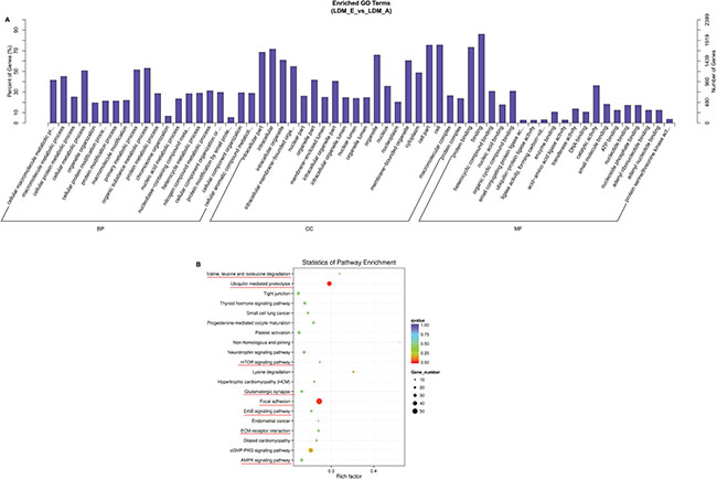 Figure 5: Annotations and enrichment of differentially expressed circRNAs. (A) The GO analysis showed 897 significantly (LDM_E VS LDM_A) enriched terms (P < 0.05) in biological process, molecular function and cellular components category. (B) A total of 270 terms were enriched of differentially expressed circRNAs in LDM_E and LDM_A group by KEGG pathway analysis. The AMPK signaling pathway, ECM-receptor interactions, ErbB signaling pathway, focal adhesion, valine, leucine and isoleucine degradation, ubiquitin mediated proteolysis, mTOR signaling pathway and glutamatergic synapse, which were involved muscle growth and development, were labeled with red lines.