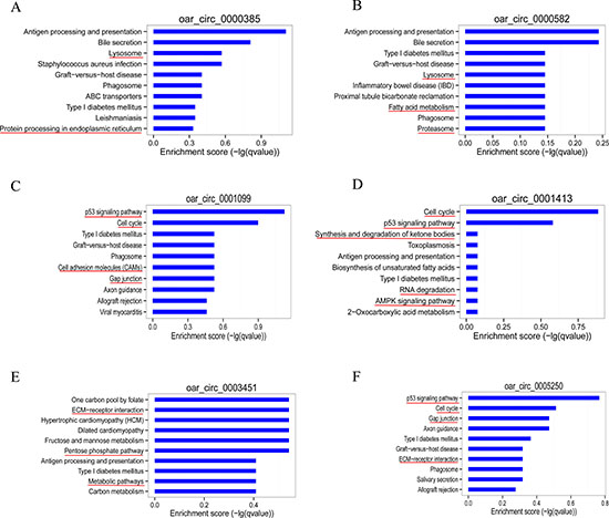Figure 7: Bioinformatics analysis of circRNA-miRNA-mRNA network with potentially effective circRNAs. Target mRNAs of the 6 networks (circRNA 0000385 (A), circRNA 0000582 (B), circRNA 0001099 (C), circRNA 0001413 (D), circRNA 0003451 (E), circRNA 0005250 (F)) are functionally annotated by KOBAS and KEGG pathway analysis. Top 10 significant (P < 0.05) enriched pathway terms of the 6 networks. Involving muscle growth and development of the signal pathway, marked with a red line.