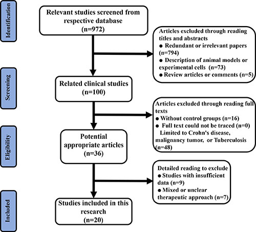 Exclusion criteria eliminated studies with the following characteristics: (1) non-comparative studies; (2) incomplete raw data; (3) limitation to animals or cells; (4) data included neither means ± SD nor medians (ranges); (5) commentaries, review papers and articles with missing or unavailable data; (6) mixed or unclear treatment methods; or (7) research on Crohn’s disease, malignant tumors or intestinal tuberculosis.