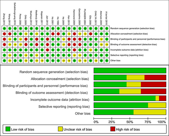 Two reviewers (Qi W and Jun S) independently rated the study quality. The Cochrane risk of bias assessment tool [40] was used to assess the methodological quality of individual studies based on following criteria: whether the study was conducted with random sequence generation and allocation concealment (for selection bias assessment); whether blinding of participants and personnel occurred (for performance bias assessment); whether blinding of outcome assessment occurred (for detection bias assessment); whether incomplete outcome data were included (for attrition bias assessment); whether selective reporting was present (for reporting bias assessment) and whether the study exhibited other biases. All investigators (Qi W, Jun S and Yukun H) assessed the quality of the examined studies through discussion until reaching agreement.