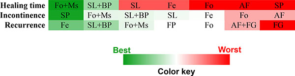 Fo+Ms was the best technique to reduce healing time. We know that most surgeons believed the classic fistulotomy technique was the correct therapy and the gold standard for treatment [30]. However, problems related to fistulotomy are numerous, including postoperative pain, bleeding and delayed wound healing [31]. The adverse effects of this technique could be changed if marsupialisation were performed simultaneously. We know that marsupialization of the open fistula was introduced to facilitate adequate lesion drainage, reduce healing time and improve continence by minimizing anal deformities [32]. Furthermore, the statistical results showed that Fo+Ms also ranked well in the other 2 parameters (Figure 4). Therefore, the clinical benefits of marsupialisation may be greater than previously thought.
