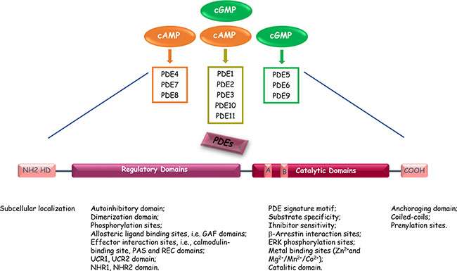Figure 1: Common structure of the different PDE enzymes. The PDE superfamily contains 11 structurally-related gene families. Some PDEs are specific for cAMP or cGMP, and some exhibit dual substrate specificity. The N-terminal portion of the PDEs contains sequences important for cellular localization. The regulatory domain contains PDE-family specific sequences responsible of modulation of PDE enzymatic activities. The catalytic domain is present in the carboxy-terminal part of PDEs and is highly conserved. A and B indicate the two Zn2 + -binding motifs (HX3HXnE/D) that include invariant histidines and are critical to catalysis. HD, Hydrophobic domains.