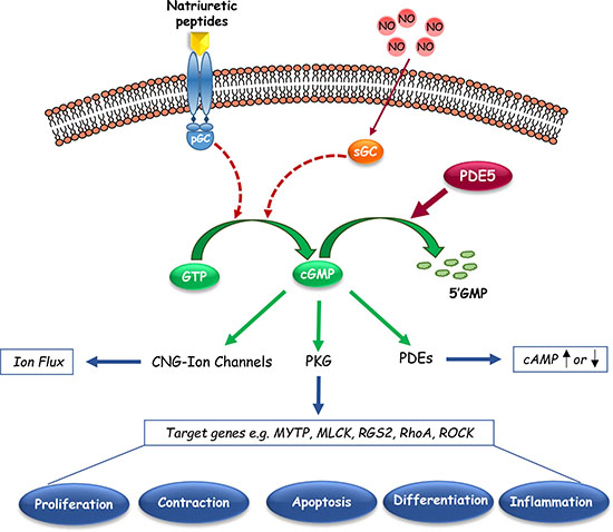 Figure 2: Schematic representation of cyclic guanosine monophosphate (cGMP) signaling pathways. This graphic shows the basic synthetic, regulatory and downstream signalings that mediate the effects of endogenous cGMP in cells. Cyclic nucleotide phosphodiesterase type 5 (PDE5), which catalyzes the hydrolytic breakdown of cGMP into its biologically inactive derivative, regulates the amplitude and the duration of cGMP signalling. pGC, particulate Guanylyl Cyclase; sGC, soluble Guanylyl Cyclase; CNG-Ion channels, cyclic nucleotide-gated Ion channels; PKG, cGMP-dependent Protein Kinase or Protein Kinase G; MYTP, Myosin Phosphatase Targeting Subunit; MLCK, Myosin Light Chain Kinase; RGS2, Regulatory of G-coupled Signaling 2; ROCK, Rho-kinase.