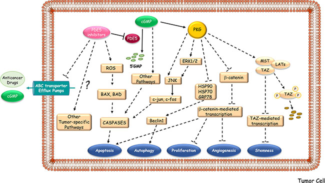Figure 3: Proposed mechanisms underlying the anti-cancer activities of PDE5 inhibitors. PDE5 inhibitors may hamper tumor progression by activating downstream signaling pathways, mainly PKG-mediated ones, which induce apoptosis, autophagy, growth suppression, inhibition of angiogenesis and of stemness. PDE5 inhibitors may also enhance the therapeutic effectiveness of multiple anti-neoplastic agents by increasing intracellular accumulation of drugs and cGMP levels through the block of the substrate efflux function of ABC multidrug-resistant transporters. ABC transporter Efflux Pumps, ATP-binding cassette transporter Efflux Pumps; ROS, Radical Oxygen Species; HSP, Heat Shock Protein; GRB78, Glucose-Regulated Protein; JNK, c-Jun N-terminal kinases; ERK, Extracellular Signal-regulated Kinases; MST, Mammalian Ste20-like Protein Kinase; LAT, Large Tumor Suppressor Kinase; TAZ, Transcription Regulator Protein-1.