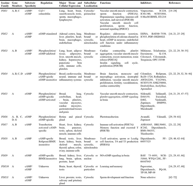 Mammalian cyclic nucleotide phosphodiesterases (PDEs) constitute a large and complex family of ubiquitously distributed hydrolases that have the unique function of catalysing the hydrolytic breakdown of cyclic adenosine monophosphate (cAMP) and cyclic guanosine monophosphate (cGMP) into the biologically inactive derivates 5′-AMP and 5′-GMP, respectively. The PDE superfamily contains 11 distinct gene families (PDEs 1 to 11), that encode at least 100 distinct PDE isoforms through alternative mRNA splicing, multiple promoters and transcription start sites in human, rat, and mouse [13]. The 11 PDEs can be grouped into three broad categories based on their sequence homology as well as substrate specificity and selectivity. PDE4, PDE7 and PDE8 are specific for cAMP hydrolysis; PDE5, PDE6 and PDE9 are specific for cGMP hydrolysis; PDE1, PDE2, PDE3, PDE10 and PDE11 exhibit dual specificity, acting on cAMP and cGMP with different affinities depending on the isoform (Figure 1 and Table 1) [13–72]. The different PDEs are modular proteins sharing the following common structural organization from N-terminus to C-terminus (Figure 1): 1) a highly divergent regulatory domain in the N-terminal portion; 2) a conserved catalytic core of approximately 270 amino acids (~ 35–50% sequence homology); 3) a region of undetermined function that can be prenylated (PDE6) or phosphorylated (PDE4) in the carboxyl terminus [19]. The N-terminal portions of PDE molecules contain structural determinants and specific amino acid sequences that are responsible for localization of individual PDE isoforms to specific intracellular sites, organelles and membranes as well as for their incorporation into particular multimolecular regulatory complexes or signalosomes. The regulatory regions contain domains that can be subjected to diverse types of modification (e.g., phosphorylation by various protein kinases), or sites that may interact with allosteric ligands (e.g., cGMP binding sites), selective effectors (e.g., Ca2+/calmodulin), protein partners (e.g., RAF1), or molecular scaffolds (e.g., caveolin). In addition, N-terminal regulatory regions include dimerization domains and autoinhibitory modules as several PDEs exist as asymmetric homo- or heterodimers (e.g., in PDEs 1, 4, and 5). Informations from the crystal structures of isolated catalytic cores of PDEs have revealed that these domains exhibit the same topography, composed of aminoacids folded into 16 helices [73]. The active site forms a deep hydrophobic pocket that includes a histidine-rich PDE signature sequence motif and consensus metal binding domains, represented by two Zn2+ binding motifs (motifs A and B – HX3HXnE/D) and an additional binding site whose metals could be Mg2+, Mn2+ or Co2+ [73, 74]. In addition to the conserved portions important for cyclic nucleotide and inhibitor bindings, the catalytic domain also encompasses variable determinants that are responsible of PDE family-related substrate affinities and selectiveness [75].