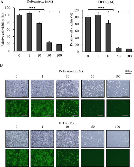 Figure 2: The inhibitory effect of deferasirox and DFO on miPS-LLCcm cells in vitro. (A) Cultured miPS-LLCcm cells were treated with different concentrations of deferasirox and DFO for 48 hours and cell viability was then evaluated using the XTT assay. Cell viability in the absence of treatment was set at 100%. Results are means of 3 independent experiments. Data are represented as average ± S.E.M. (n = 5). ***p < 0.001. (B) Normal and fluorescence microscopy findings showed that numbers of GFP positive and negative cells were decreased in a dose dependent manner.