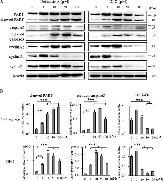 Figure 3: Western blot analysis of apoptosis and cell cycle related proteins in miPS-LLCcm cells. (A) Cultured miPS-LLCcm cells were treated with different concentrations of deferasirox and DFO for 48 hours. Cells were then harvested and total protein was analyzed for expression of the indicated proteins. Deferasirox and DFO induced the apoptosis related markers, cleaved caspase 3 and cleaved PARP, and decreased the cell cycle related marker, cyclin D1. (B) Densitometry analysis of the western blots also showed deferasirox and DFO significantly induced cleaved caspase 3 and cleaved PARP, and decreased cyclin D1 and cyclin E1. Data are represented as average ± S.E.M. (n = 3) *p < 0.05, **p < 0.01, ***p < 0.001.
