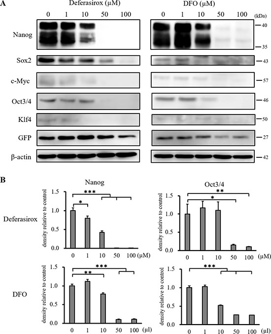 Figure 4: Western blot analysis of stemness marker expression in miPS-LLCcm cells. (A) Cultured miPS-LLCcm cells were treated with different concentrations of deferasirox and DFO for 48 hours. Cells were then harvested and total protein was analyzed for the expression of indicated proteins. Deferasirox and DFO decreased the expression of stemness markers. (B) Densitometry analysis of the western blots also showed deferasirox and DFO significantly decreased the expression of the stemness markers, Nanog and Oct3/4. Data are represented as average ± S.E.M. (n = 3) *p < 0.05, **p < 0.01, ***p < 0.001.