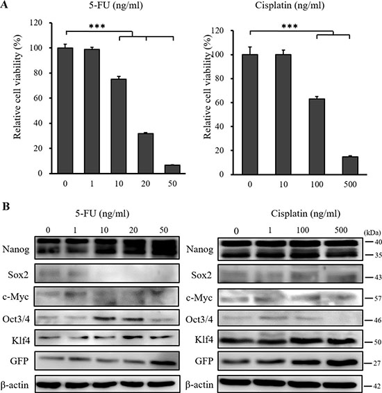Figure 5: XTT cell proliferation assay and western blot analysis of miPS-LLCcm cells following 5-FU and cisplatin treatment. (A) Cultured miPS-LLCcm cells were treated with different concentrations of 5-FU and cisplatin for 48 hours, and cell viability was then evaluated using the XTT assay. 5-FU and cisplatin suppressed the proliferation of miPS-LLCcm cells in a dose dependent manner. Cell viability in the absence of treatment was set at 100%. Results are means of 3 independent experiments. Data are represented as average ± S.E.M. (n = 5). ***p < 0.001. (B) Cultured miPS-LLCcm cells were treated with different concentrations of 5-FU and cisplatin for 48 hours. Cells were then harvested and total protein was analyzed for expression of the indicated proteins. Western blot analysis showed that 5-FU and cisplatin did not suppress the expression of stemness markers.