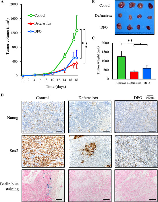 Figure 6: Iron chelators suppressed the growth of CSC tumor allografts and suppressed stemness marker expression. (A) miPS-LLCcm cells (1 × 106 per animal) were implanted subcutaneously into the right back flank of mice and treatment commenced 5 days after tumor injection. Deferasirox and DFO (30 mg/kg locally, given by injection 5 days per week for 14 days) effectively inhibited the growth of miPS-LLCcm allografts in vivo. *p < 0.05, **p < 0.01. (B) Macroscopic images showed that tumors in both deferasirox and DFO groups were smaller than in the control group. (C) Tumor weight was significantly decreased in the deferasirox and DFO groups. Data are represented as average ± S.E.M. (n = 4). **p < 0.01. (D) Resected tumors were analyzed for Nanog and SOX2 expression by immunohistochemistry, and Fe3+ by Berlin blue staining. Nanog and SOX2 were suppressed in the deferasirox and DFO groups. Berlin blue staining was not detected in the deferasirox and DFO groups.