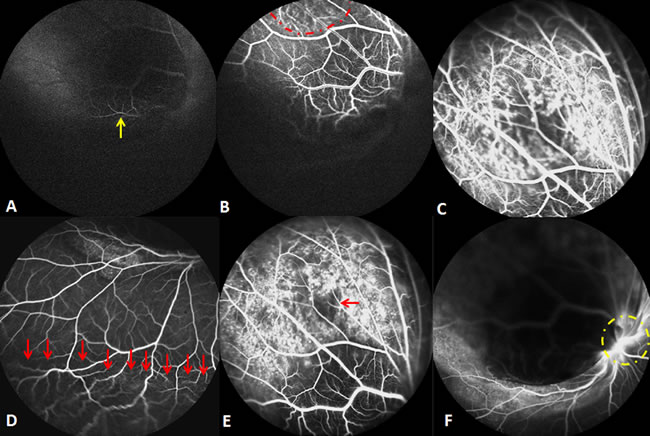Figure 3: Findings six weeks after the initial PDT. A. The choroidal metastasis lesion appeared to be relatively hypofluorescent in the early FFA frame, with retinal artery filling (yellow arrow). B. Double circulation was observed during the arterial to venous phase FFA frames (red dots region). C & D. The middle FFA frame showed the superficial dilated retinal capillaries over the mass (C) and peripheral retinal serous detachment (D. red arrows). E. The patched hypofluorescent necrosis region is demonstrated in the late FFA frame (red arrow). F. The late FFA frame shows that the mass had already involved the optic disc (yellow dots circle).