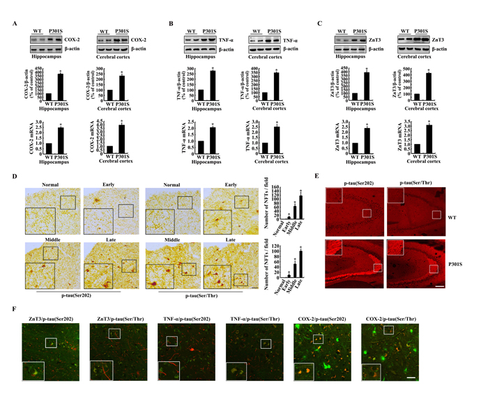 The expression of COX-2, TNF-α, ZnT3 and phosphorylation of tau at the sites of both Ser 202 and Ser 400/Thr 403/Ser 404 were elevated in 6-month-old TauP301S Tg mice