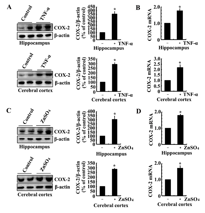 Figure 2: Intracerebroventricular injection of ZnSO4 and TNF-α to the ventricles of WT mice increases the expression of COX-2. (A-D) The WT mice at the age of 6 months were injected (i.c.v) with ZnSO4 (10 µg/5 µl) or TNF-α (1 ng/5 µl) (n=12). The brains were then collected after 24 h. mRNA and protein levels of COX-2 were determined by qRT-PCR and western blot, respectively. Total amounts of GAPDH and β-actin served as an internal control. The data represent the means ± S.E.. *, p<0.05 with respect to PBS (-)-injected (i.c.v) controls.
