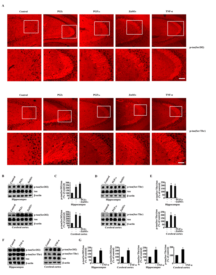 Figure 4: PGI2 and F2α mediated the effects of ZnSO4and TNF-α on stimulating the phosphorylation of tau at the sites of both Ser 202 and Ser 400/Thr 403/Ser 404. The WT mice at the age of 6 months were injected (i.c.v) with PGI2 (1 µg/5 µl), PGF2α (1 µg/5 µl), ZnSO4 (10 µg/5 µl) or TNF-α (1 ng/5 µl) (n=12). (A) The phosphorylation of tau at the sites of both Ser 202 and Ser 400/Thr 403/Ser 404 were determined by immunostaining using the correspondent antibody. (B-G) Western blots were further used to determine the phosphorylation of tau at the sites of both Ser 202 and Ser 400/Thr 403/Ser 404. The intensity of bands was analyzed by Bio-Rad imaging software. The data represent the means ± S.E.. *, p<0.05 with respect to PBS (-)-injected (i.c.v) controls.