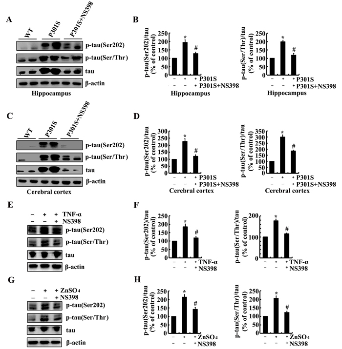 As the potential roles of Zn2+ and TNF-α in inducing the phosphorylation of tau via upregulating the expression of COX-2, it is necessary to verify if COX-2 mediates the effects of Zn2+ and TNF-α on stimulating the phosphorylation of tau. As a first step, experiments were carried out to inject (i.c.v) into the ventricles of 6-month-old TauP301S Tg mice. The results demonstrated that NS398, a COX-2 inhibitors (1 µg/5 µl) treatment clearly decreased the phosphorylation of tau at the sites of both Ser 202 and Ser 400/Thr 403/Ser 404 in the hippocampus and cerebral cortex of TauP301S Tg mice (Figure 5A-5D). In addition, NS398 (100 µM) treatment blocked the effects of TNF-α (10 ng/ml) and ZnSO4 (10 µM) on stimulating the phosphorylation of tau at the sites of Ser 202 and Ser 400/Thr 403/Ser 404 in n2a cells (Figure 5E-5H). Therefore, it is clear that Zn2+ and TNF-α regulate the phosphorylation of tau via COX-2 activation.