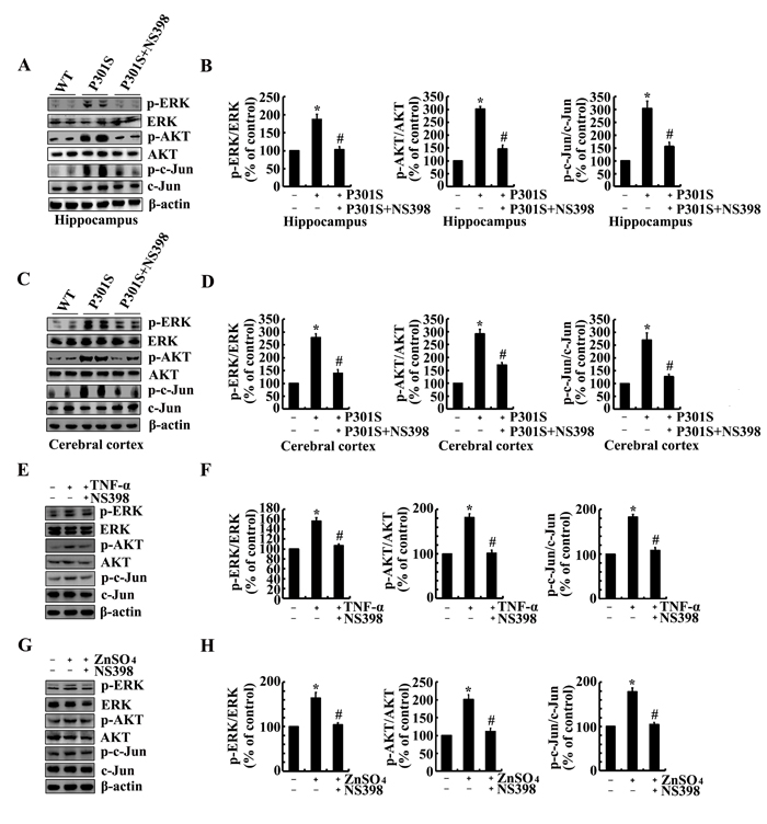 Figure 6: NS398 treatment decreases the activity of PI3-K/AKT, ERK1/2 and JNK/c-Jun pathways in 6-month-old TauP301S Tg mice and TNF-α- or ZnSO4-stimulated n2a cells. (A-D) The TauP301S Tg mice at the age of 6 months were injected (i.c.v) with NS398 (1 µg/5 µl) and the brains were then collected after 24 h. (E-H) In select experiments, the n2a cells were treated with TNF-α (10 ng/ml) or ZnSO4 (10 µΜ) in the absence or presence of NS398 (100 µΜ) for 24 h. The phosphorylation of AKT, ERK1/2 and c-Jun were determined by western blots. The intensity of bands was analyzed by Bio-Rad imaging software. The data represent the means ± S.E. *, p<0.05 with respect to WT or vehicle-treated controls. #, p<0.05 with respect to TauP301S Tg mice or TNF-α-, ZnSO4-treated alone.