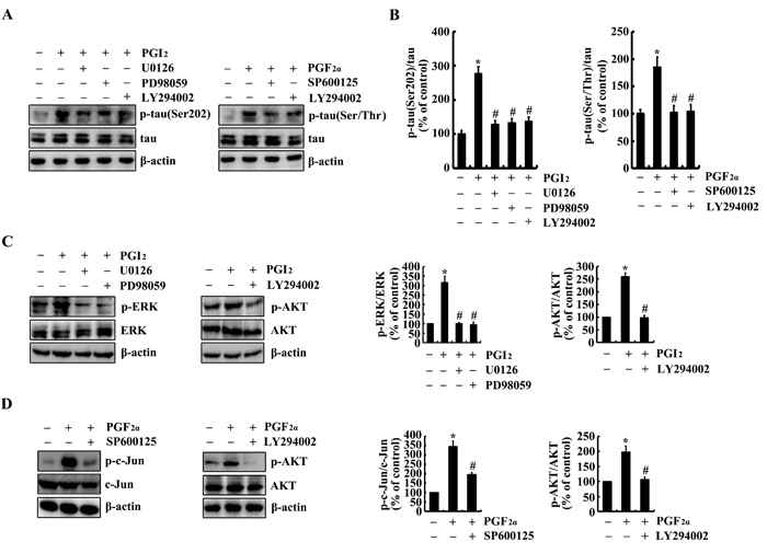 Figure 7: Involvement of PI3-K/AKT, ERK1/2 and JNK/c-Jun pathways in regulating tau phosphorylation at the sites of both Ser 202 and Ser 400/Thr 403/Ser 404 in PGI2- or PGF2α-stimulated n2a cells. n2a cells were treated with PGI2 (10 µΜ) or PGF2α (1 µΜ) in the absence or presence of PI3-K inhibitor, LY294002 (20 µΜ), ERK1/2 inhibitor, PD98059 (20 µΜ) and U0126(20 µΜ), JNK inhibitor, SP600125 (10 µΜ), for 24 h. (A, B) The phosphorylation of tau at the sites of both Ser 202 and Ser 400/Thr 403/Ser 404 were determined by western blots. (C, D) The phosphorylation of AKT, ERK1/2 and c-Jun were determined by western blots. The intensity of bands was analyzed by Bio-Rad imaging software. The data represent the means ± S.E. *, p<0.05 with respect to vehicle-treated controls. #, p<0.05 with respect to PGI2 or F2α-treated alone.
