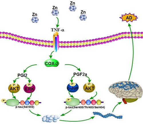 Key roles of COX-2 in mediating the effects of Zn2+ and TNF-α on stimulating the phosphorylation of tau at the sites of both Ser 202 andSer 400/Thr 403/Ser 404