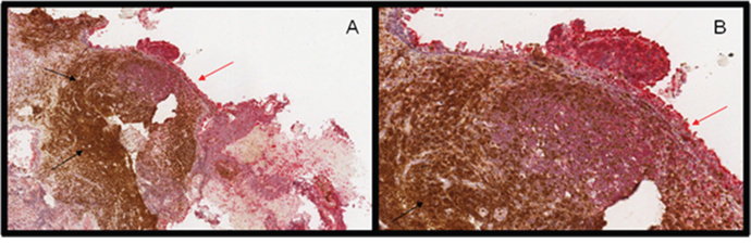 Figure 1: (A-B) RANK (red arrows) and CD3/CD20 (black arrows) double staining of primary nasopharyngheal carcionoma. RANK expression is evident in normal nasopharyngeal cells while tumor cells, surrounded by lymphoid infiltrate, present with weak stining.