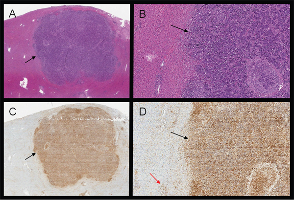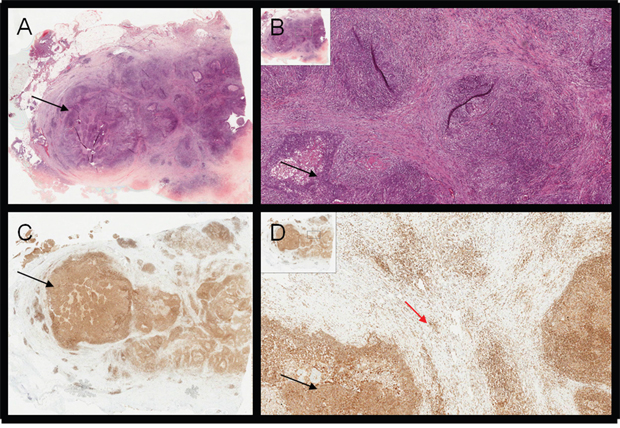Figure 3: (A-B) H&E of lymph node metastasis of NPC; (C-D) corresponding RANK staining (black arrows); white cells provide the positive internal control in the context of neoplastic island (red arrow).