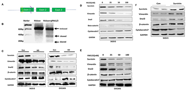 Figure 2: Lentiviral CRISPR/Cas9 nickase-mediated BIRC5 gene editing led to inhibition of EMT in ovarian cancer cells. (A) Schematic diagram of two gRNAs targeting exon 1 of BIRC5 gene. (B) DNA surveyor mutation assay showing two cleaved products presented in BIRC5 knockout, but not in control, cells. (C) EMT marker gene expression was examined in BIRC5 knockout and control SKOV3 and OVCAR3 cells by using Western blot. (D, E) EMT markers were examined in YM155-treated and control SKOV3 and OVCAR3 cells by Western blot. (F) EMT markers were examined by Western blot in BIRC5 expressing and control SKOV3 cells.