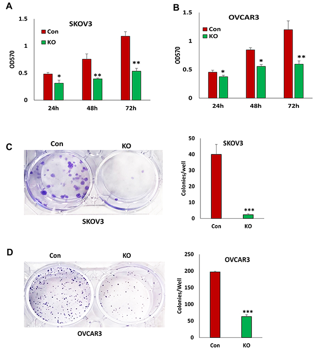 Figure 3: Lentiviral CRISPR/Cas9 nickase-mediated BIRC5 gene editing reduced cell proliferation in ovarian cancer cells. (A, B) Cell proliferation in BIRC5 knockout and control SKOV3(A) and OVCAR3 (B) cells at different time points was determined by MTT assay (*P<0.05;**P<0.01). (C, D) Cell survival in BIRC5 knockout SKOV3 (C) and OVCAR3 (D) cells was determined by colony formation assay (***P<0.001).
