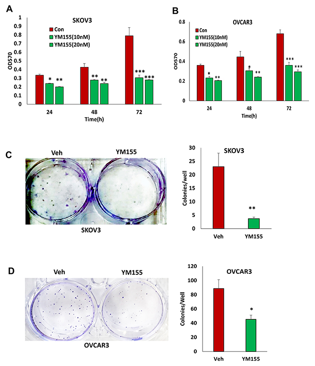 Figure 4: Inhibition of BIRC5 expression using YM155 reduced cell proliferation in ovarian cancer cells. (A, B) Cell proliferation in wild type ovarian cancer SKOV3 (A) and OVCAR3 (B) cells was determined following treatment using 10 and 20 nM YM155 at different time points by MTT assay (*P<0.05;**P<0.01;***P<0.001). (C, D) Cell survival was determined using a colony formation assay following treatment with 5 nM YM155 (*P<0.05;**P<0.01;***P<0.001).