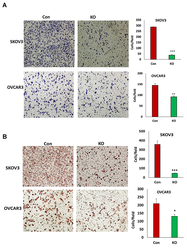Figure 5: Lentiviral CRISPR/Cas9 nickase mediated BIRC5 gene editing reduced cell migration and invasion in ovarian cancer cells. (A) Cell migration in BIRC5 knockout and control SKOV3 or OVCAR3 cells was examined using transwell plates, and migrated cells were stained with crystal blue and counted (**P<0.01;***P<0.001). (B) Cell invasion in both BIRC5 knockout and control SKOV3 or OVCAR3 cells was examined using Matrigel-coated plates, and invaded cells were stained with H.E. and counted (*P<0.05;***P<0.001).