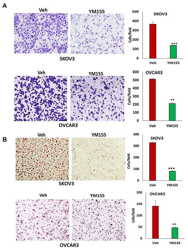 Figure 6: Inhibition of BIRC5 expression using YM155 reduced cell migration and invasion in ovarian cancer cells. (A) Cell migration in 5 nM YM155- and vehicle-treated SKOV3 and OVCAR3 cells was examined using transwell plates, and migrated cells were stained with crystal blue and counted (**P<0.01;***P<0.001). (B) SKOV3 and OVCAR3 cells were treated with 5 nM YM155 for 4 h, and invasion was examined using Matrigel-coated plates, and invaded cells were stained with H.E. and counted (*P<0.05;***P<0.001).