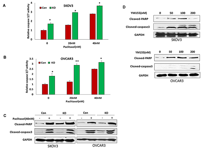 BIRC5 expression in ovarian cancer cells may contribute to chemoresistance. To test whether a loss of BIRC5 expression sensitized the cell response to chemotherapy, we treated BIRC5 knockout and control SKOV3 and OVCAR3 cells with different doses of paclitaxel. Loss of BIRC5 expression induced cell apoptosis as shown by caspase3/7 activity and sensitized cell response to paclitaxel treatment at 20 and 40 nM doses in both SKOV3 (Figure 7A) and OVCAR3 (Figure 7B) cells. Using Western blot, we also detected cell apoptosis by examining cleaved PARP and cleaved caspase3. Both apoptotic proteins were significantly induced by losing BIRC5 expression with or without paclitaxel (Figure 7C). To test whether an inhibition of BIRC5 expression with YM155 also induced cell apoptosis, both SKOV3 and OVCAR3 cells were treated with different doses from 50 to 200 nM; using Western blot, we detected apoptosis by examining cleaved PARP and caspase3 and found that inhibiting BIRC5 expression using YM155 induced cell apoptosis in both ovarian cancer cells (Figure 7D). Our data indicate that disruption of BIRC5 expression enhanced the efficacy of chemotherapy in ovarian cancer cells.