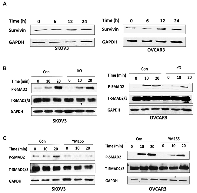 As we showed in our previous study, TGFβ promoted EMT in ovarian cancer cells [30]. To understand how BIRC5 regulates EMT in ovarian cancer cells, we tested the correlation between survivin and the TGFβ pathway in ovarian cancer cells. First, we determined BIRC5 expression in both SKOV3 and OVCAR3 cells following TGFβ treatment at different time points (0, 6, 12, 24h ) and found that TGFβ induced survivin expression (Figure 8A). Next, to determine whether BIRC5 expression was involved in the TGFβ pathway we treated BIRC5 knockout and control SKOV3 and OVCAR3 cells at different time points (0, 10 and 20 min) and then examined phospho- and total SMAD2 by using Western blot. Loss of survivin resulted in attenuating the TGFβ signaling pathway in the BIRC5 knockout compared to control cells (Figure 8B). We also determined the TGFβ pathway following 20 nM YM155 treatment and found that inhibition of survivin attenuated phospho-SMAD2 in both SKOV3 and OVCAR3 cells (Figure 8C). Our data indicated that loss of BIRC5 expression attenuated the TGFβ signaling pathway, thereby potentially leading to the inhibition of EMT in ovarian cancer cells.