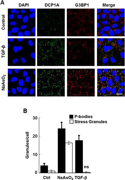 Figure 1: TGF-β induces the formation of P-bodies. (A) NMuMG cells were treated without (Control) or with TGF-β for 24 h or sodium arsenite for 1 h, fixed and stained with anti-DCP1A (green) or anti-G3BP (red) to detect P-bodies or stress granules, respectively. Nuclei were stained with DAPI (blue). Bar, 10 μm. (B) The number of granules (P-bodies or stress granules) per cell was quantified (n > 100 cells per treatment). Data represents means ± SEM for triplicate experiments.