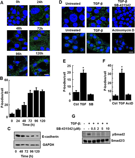 To explore the nature of this response, we treated NMuMG cells with TGF-β over the course of 120 h and monitored P-body formation. Treatment with TGF-β resulted in a progressive increase in P-body numbers that reached a maximum around 72 h and persisted throughout the 5-days of treatment (Figure 2A and 2B). During this time, cells underwent a morphological change from an epithelial to a mesenchymal phenotype and exhibited a decrease in the expression of E-cadherin as expected of cells undergoing EMT (Figure 2C). Activation of the SMAD pathway is a major downstream mechanism by which TGF-β induces the expression of transcription factors such as SNAI1 and TWIST to drive EMT. Accordingly, treatment of NMuMG cells with the type 1 TGF-β receptor kinase inhibitor SB-431542 blocked TGF-β-induced P-body formation at a concentration that effectively prevented SMAD2 phosphorylation (Figure 2D, 2E and 2G). To determine if TGF-β-induced gene transcription was required for P-body formation, we treated cells with TGF-β in the presence or absence of the transcriptional inhibitor actinomycin D. Actinomycin D also blocked the TGF-β-mediated induction of P-bodies (Figure 2D and 2F).
