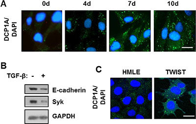 Figure 4: TGF-β promotes P-body accumulation HMLE and DG75 cells. (A) HMLE cells were treated with TGF-β for the indicated times in days. Cells were fixed and stained with antibodies against DCP1A (green). Nuclei were stained with DAPI (blue). (B) HMLE cells were treated without (-) or with (+) TGF-β for 120 h. Cell lysates were examined by Western blotting using antibodies against E-cadherin, SYK, and GAPDH. (C) HMLE cells and HMLE cells expressing TWIST (TWIST) were fixed and stained with antibodies against DCP1A (green). Nuclei were stained with DAPI (blue). Bar, 10 μm.