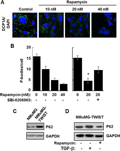 Figure 6: Autophagy promotes P-body clearance. (A) NMuMG cells expressing TWIST were cultured in the absence (Control) or presence of rapamycin at the indicated concentrations for 24 h and stained with anti-DCP1A to visualize P bodies (green). Nuclei were stained with DAPI (blue). Bar, 10 μm. (B) NMuMG cells expressing TWIST were cultured in the presence of rapamycin at the indicated concentrations and in the absence (-) or presence (+) of SBI-0206965 for 24 h. The average number of P-bodies per cell ± SEM (n > 150 cells per treatment) was quantified from triplicate experiments. Data were analyzed by one-way ANOVA *P = 0.002. (C) Lysates from NMuMG and NMuMG-TWIST cells were examined by Western blotting using antibodies against p62 and GAPDH. (D) NMuMG-TWIST cells were treated without (-) or with (+) TGF-β for 24 h. Cells were allowed to recover in fresh media lacking (-) or containing rapamycin (20 nM) (+). Cell lysates were examined by Western blotting using antibodies against p62 and GAPDH.