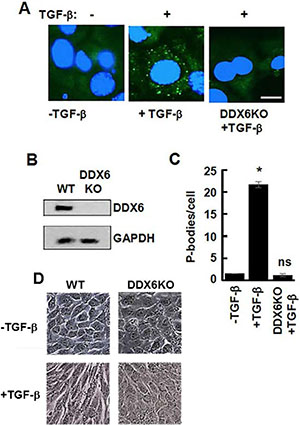 Figure 8: Lack of TGF-β-induced EMT in DDX6-deficient 4T1 cells. (A) 4T1 mammary carcinoma cells and 4T1 cells lacking DDX6 (DDX6KO) were treated without (-) or with (+) TGF-β for 48 h. Cells were fixed and stained with antibodies against DCP1A (green). Nuclei were stained with DAPI (blue). Bar, 10 μm. (B) Lysates from 4T1 cells and 4T1 cells lacking DDX6 (DDX6KO) were analyzed by Western blotting using antibodies against DDX6 and GAPDH. (C) Average number of P-bodies per cell ± SEM (n > 100 cells per treatment) from the experiment in panel A was quantified from triplicate experiments. *P < 0.001 compared to control, untreated cells. ns, not significant. (D) 4T1 cells (WT) or 4T1 cells lacking DDX6 (DDX6KO) were examined by light microscopy before (-TGF-β) and after (+TGF-β) treatment for 48 h with TGF-β.